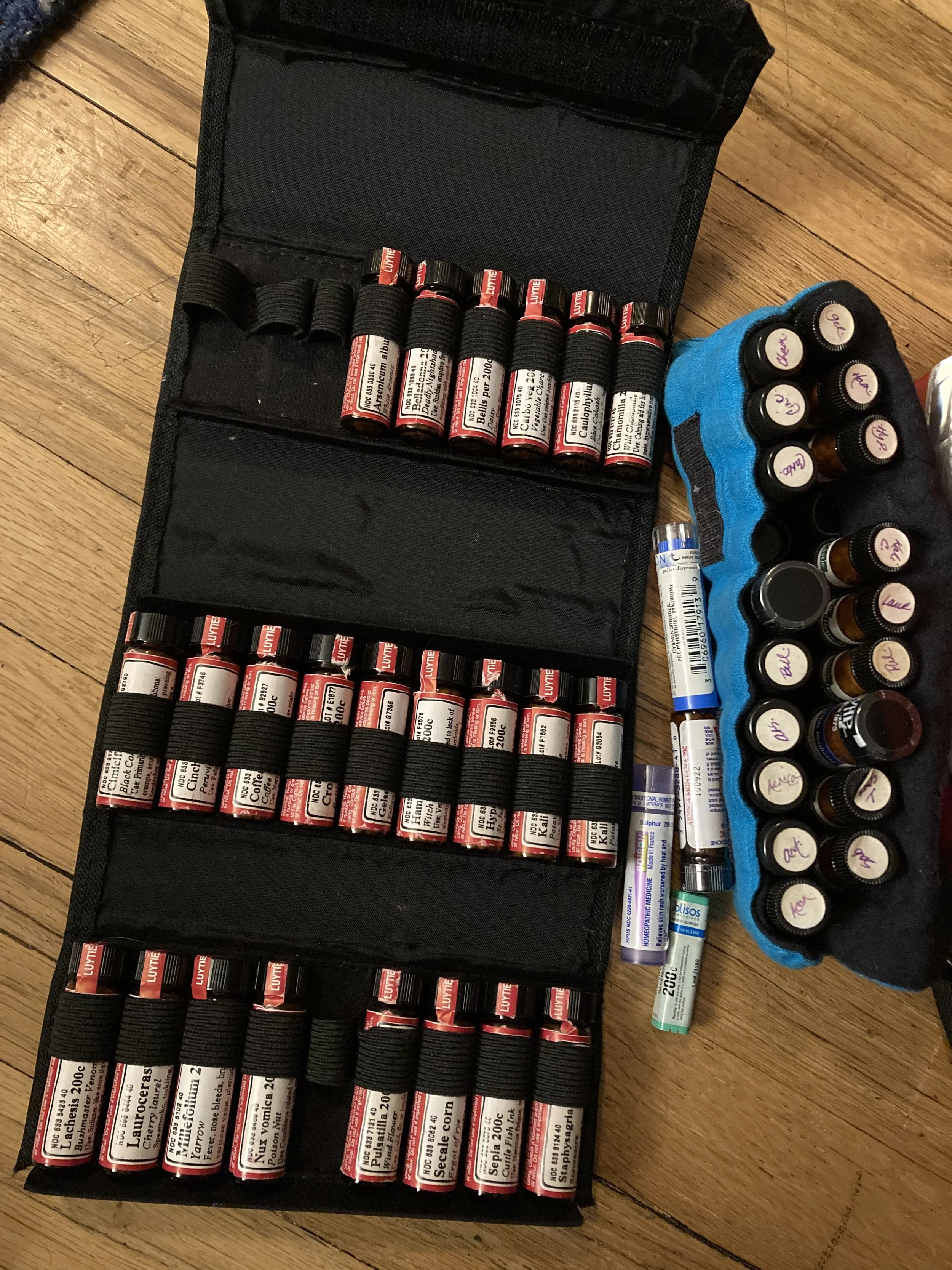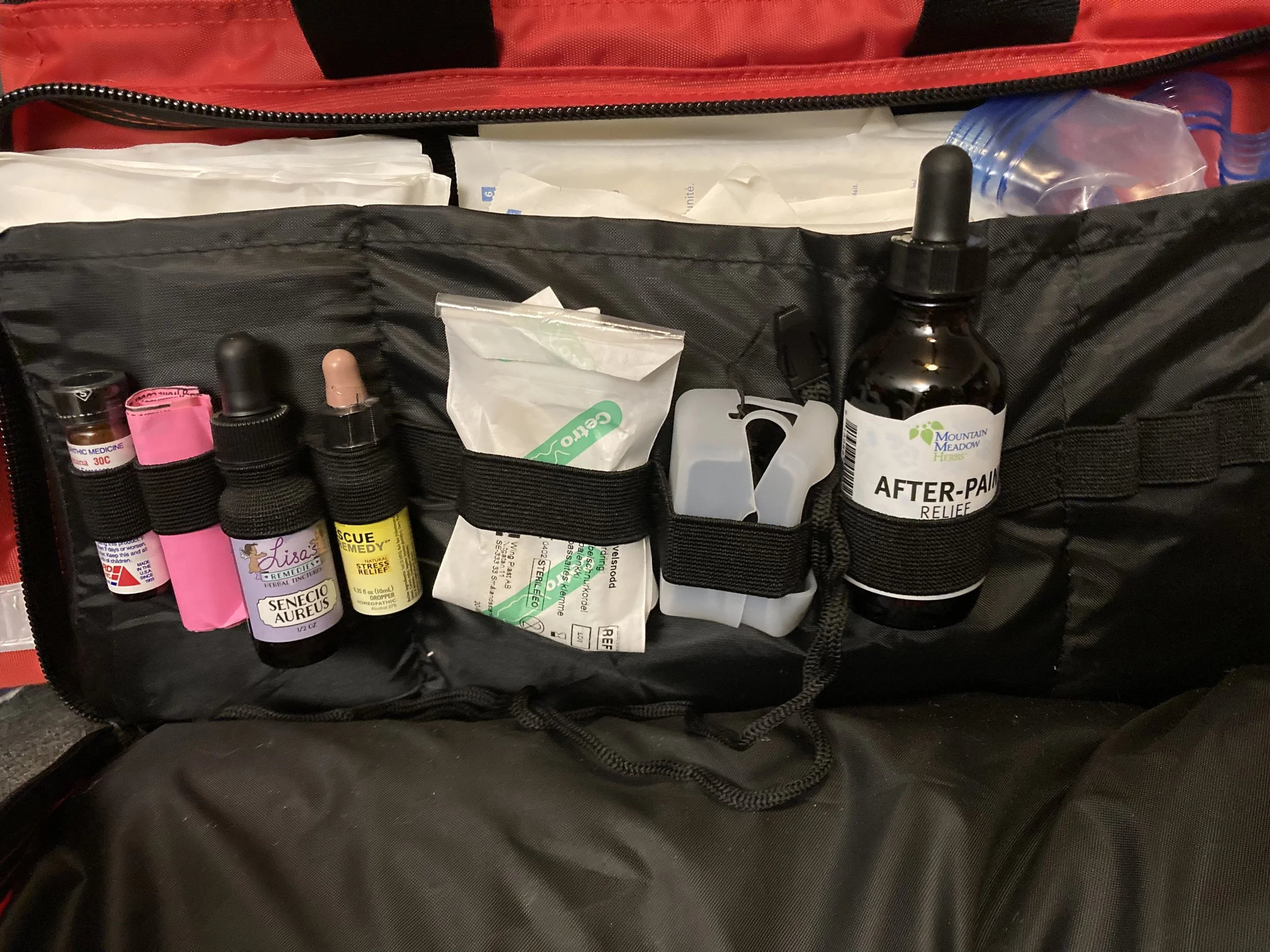 The front pocket has more herbal and homeopathic remedies, a cord ring and cord tape, an adult pulse oximeter, sterile gloves and gauze, and syringes in various sizes.