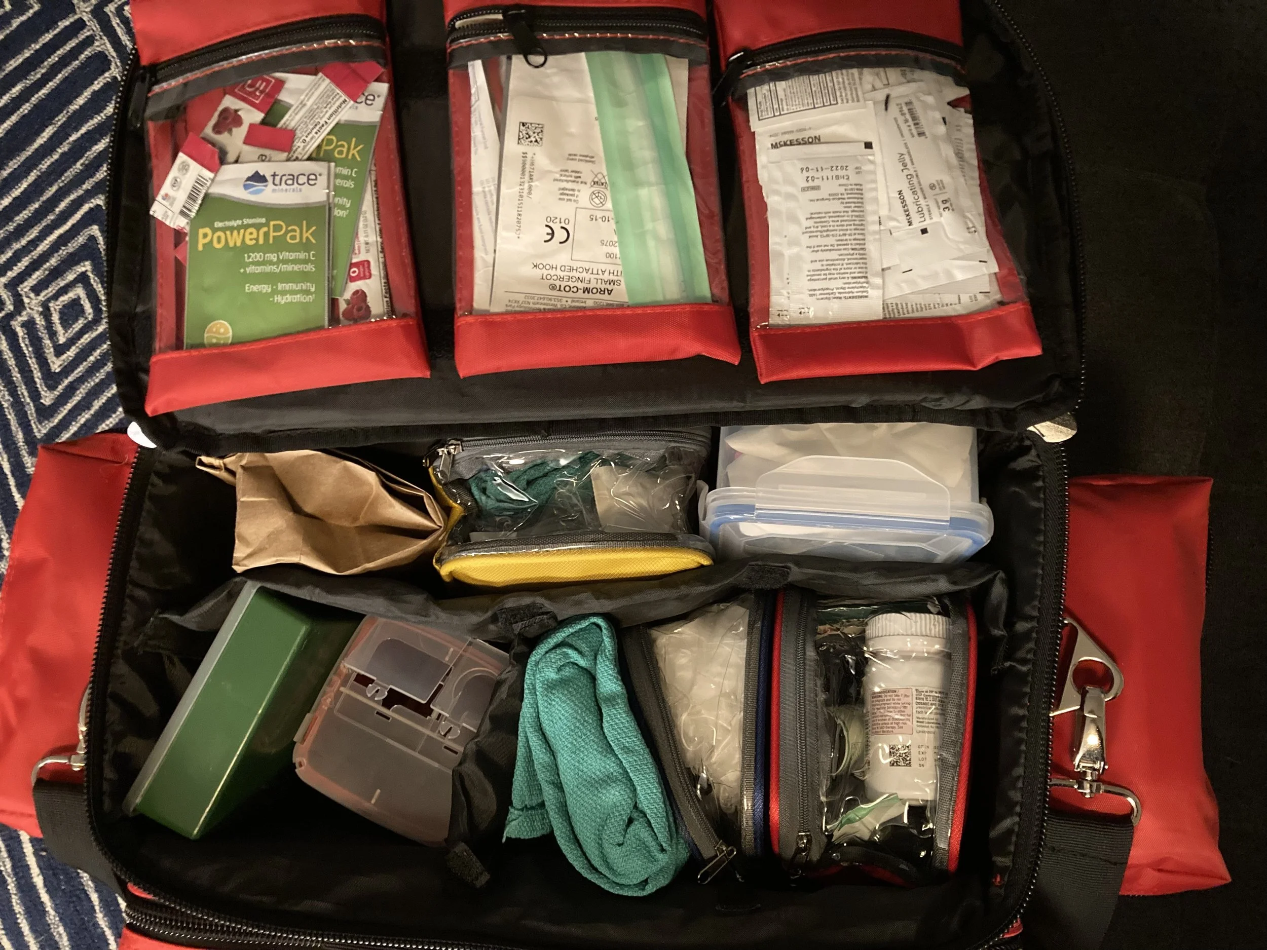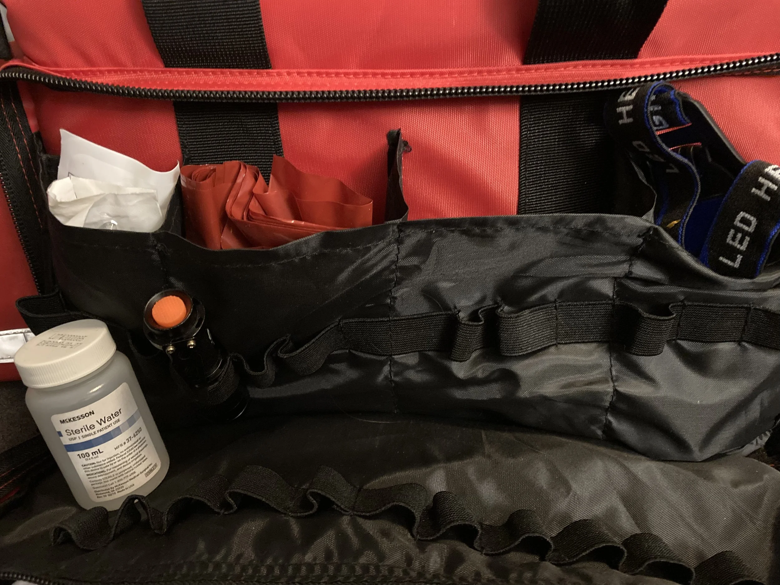 The back pocket has a heating pad, sterile water and syringes, a flashlight, headlamp, and bags for the placenta.